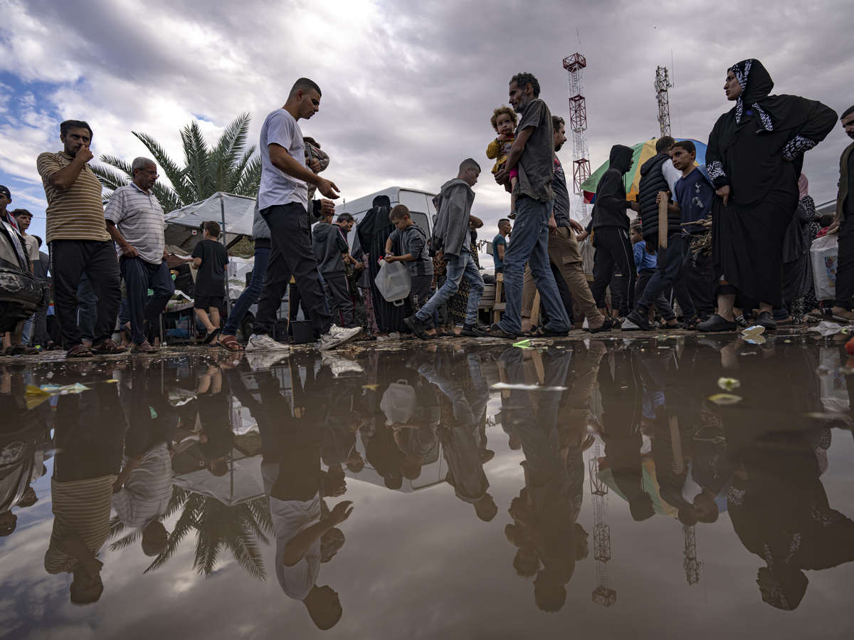 Palestinians displaced by the Israeli bombardment of the Gaza Strip walk in a United Nations Development Programme-provided tent camp in Khan Younis,Nov.15, 2023.
