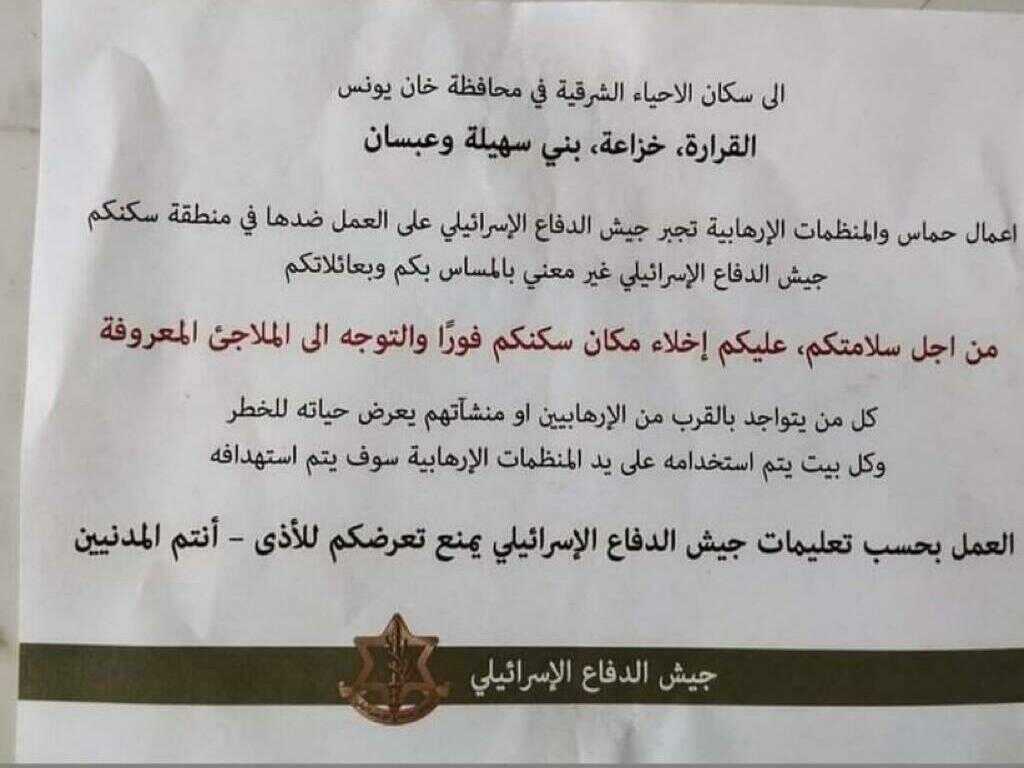 The flyers ordered civilians in areas east of Khan Younis, which is in southern Gaza, to evacuate to “known shelters.” This includes people in the towns of Al Qarara, Khuza’a, Bani Suheila and Abasan, according to United Nations Office for the Coordination of Humanitarian Affairs.