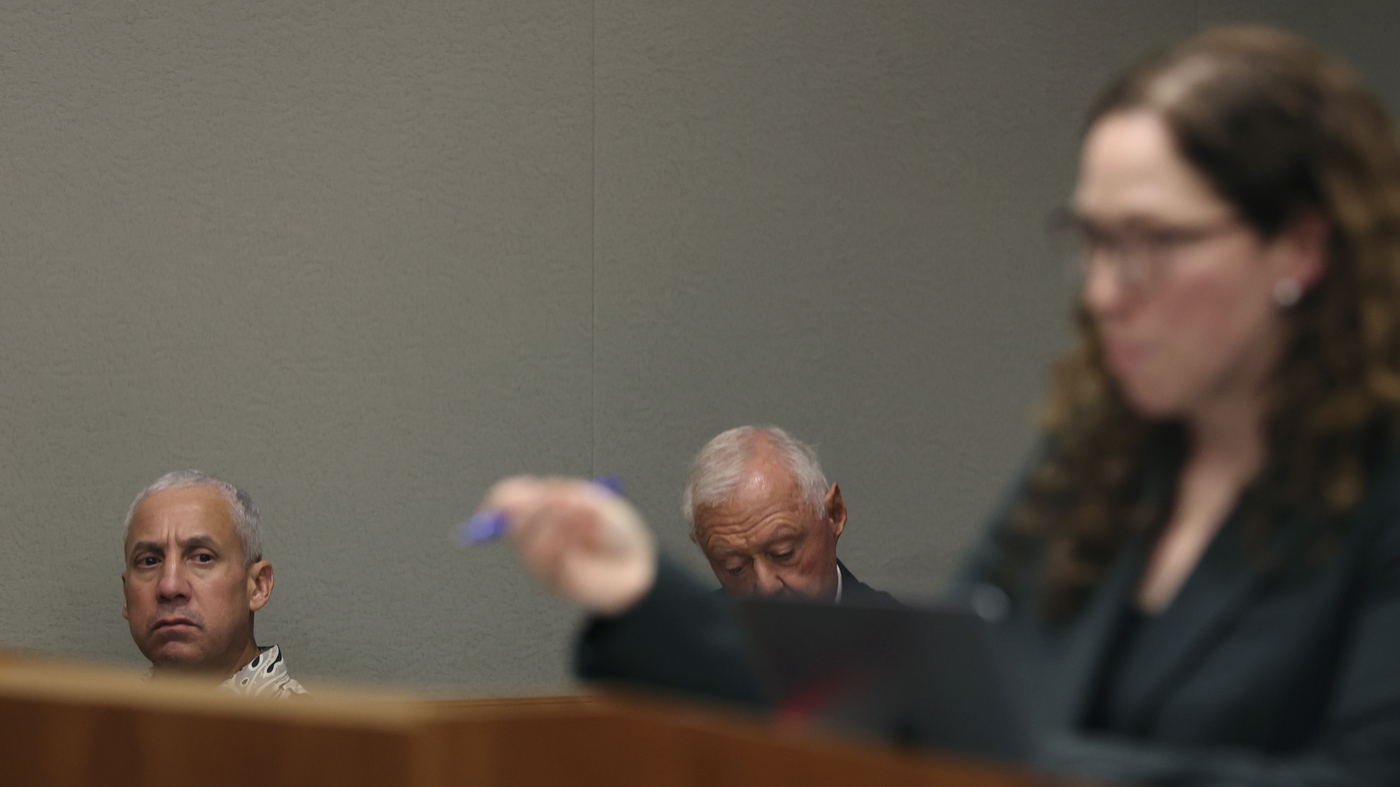 Albert “Ian” Schweitzer, left, looks on as Innocence Project attorney Susan Freidman speaks during Schweitzer’s court case Tuesday, Jan. 24, 2023, in Hilo, Hawaii.
